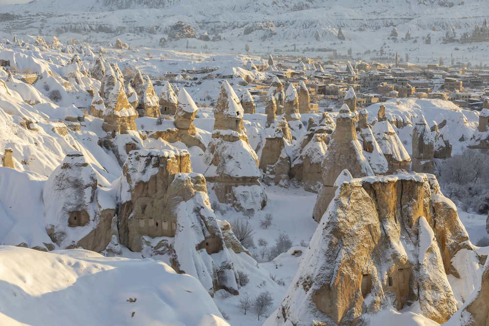 Snow-covered fairy chimneys create magical scenery, though balloon flights may be weather dependent.