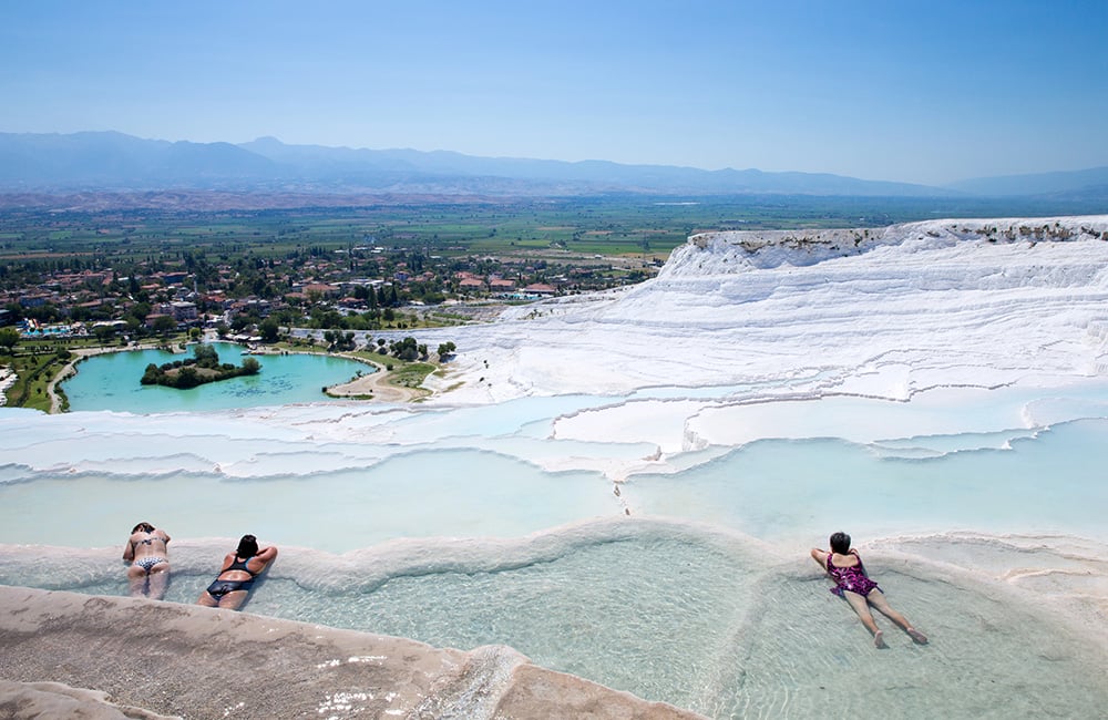 Pamukkale’s white terraces are formed by mineral-rich thermal waters flowing down the hillside.