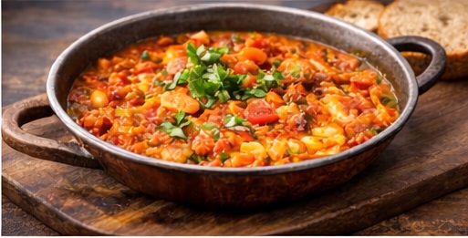 A Turkish-style scrambled egg dish cooked with tomatoes and peppers.