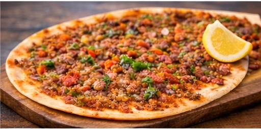 Thin, crispy dough topped with minced meat, herbs, and spices.
